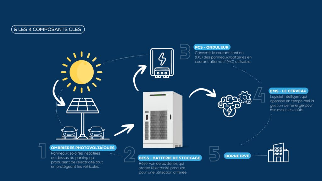 l’EMS (Energy Mamagement Storage) permet de piloter l’ensemble du système ombrières photovoltaïque, batterie de stockage et borne de recharge. Il analyse en temps réel la production solaire, l’état de charge des batteries et les besoins du site pour optimiser son utilisation. Il décide quand stocker, quand restituer et quand alimenter les bornes.